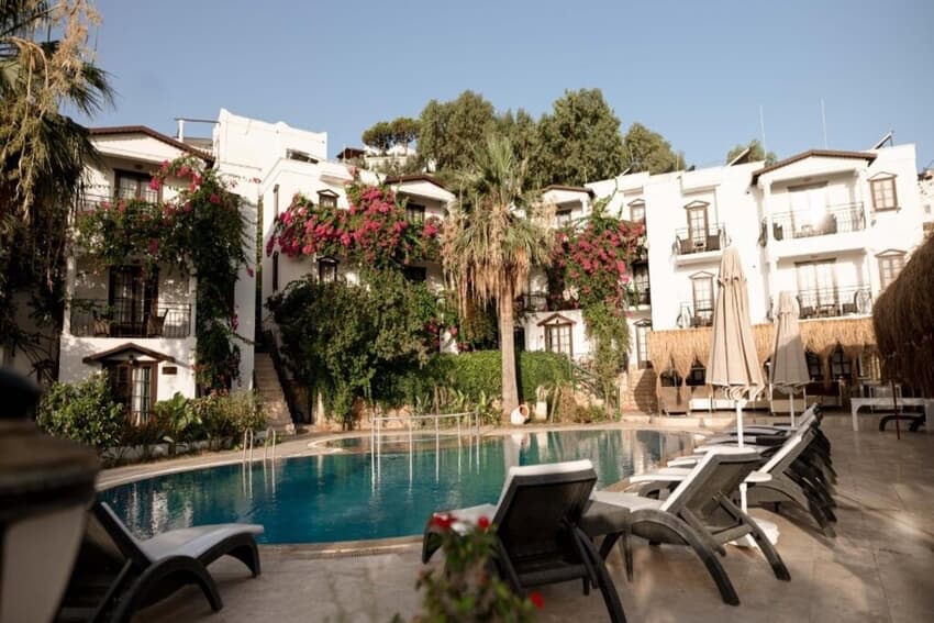 Palmiye ağaçları ve rengarenk begovillerle çevrili olan tesisin bahçesinde çocuk ve yetişkin havuzu bulunuyor.