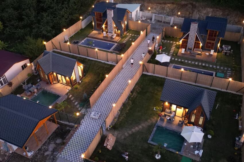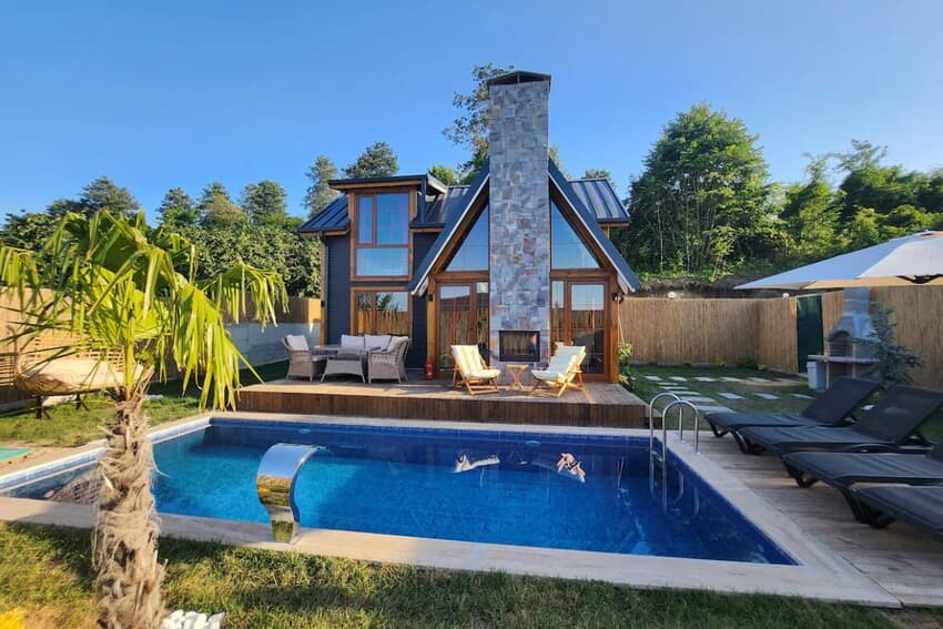 evimiz 1+1 olup tek çift kisilk yatak salonda L Koltuk takımı olup ısıtmalı havuzlu aynı zamanda banyoda jakuzisi mevcuttur bahçede barbekü ateş çukuru 2 adet şezlong güneş şemsiyesi ve bahçe takımı mevcuttur doğa içinde sessiz sakın bir zaman geçirmenin en idael yoludur sizleri tesisimize bekler şimdiden iyi tatiller dileriz